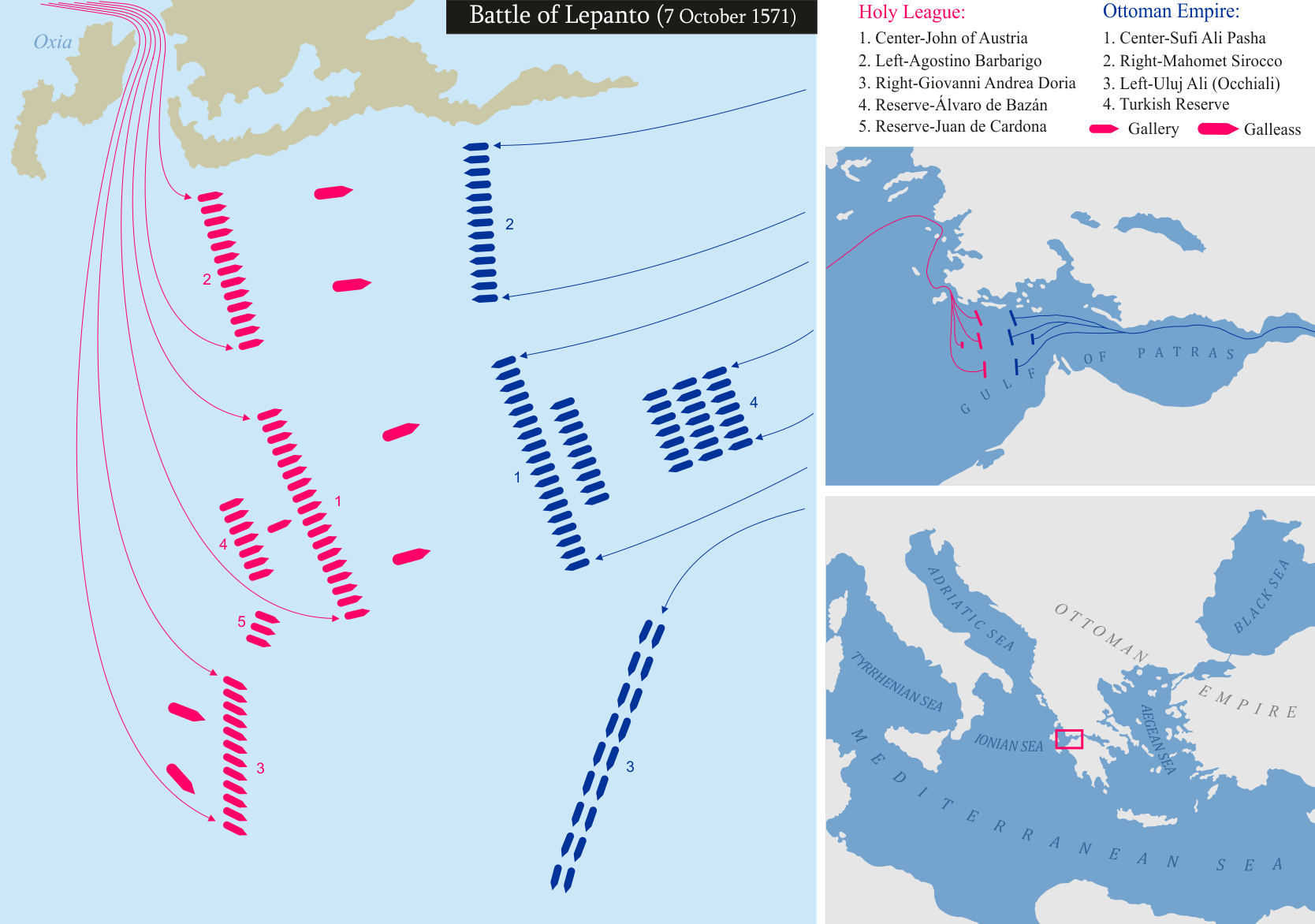 A keresztény hajóhad 1571 nyarán gyűlt össze a Messinai-öbölben. A több mint kétszáz gályát Velence, a Pápai Állam, Spanyolország, a Genovai Köztársaság, a Savoyai Hercegség, a toszkánai Szent István Lovagrend, valamint a Máltai Lovagrend szerelte föl.
