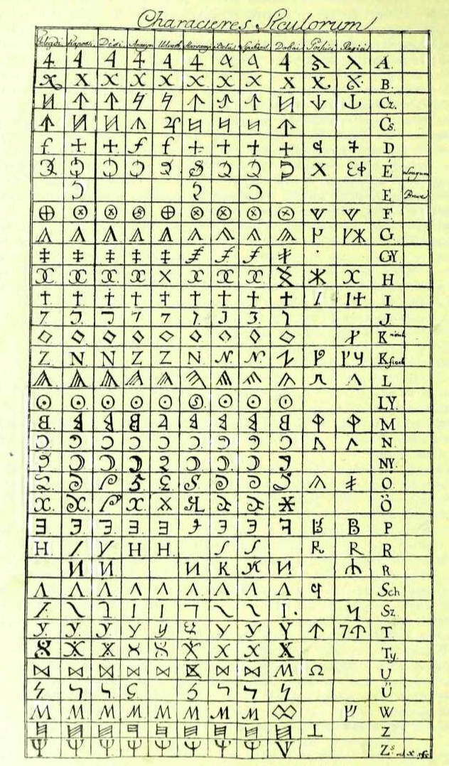 Az egyik marosvásárhelyi kézirat betűtáblázata (Forrás: Sebestén Gyula: A magyar rovásírás hiteles emlékei, 114. o. (mek.oszk.hu))