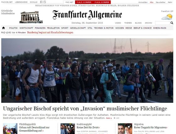 Nem ért egyet Ferenc pápa kijelentésével – miszerint a katolikusoknak erkölcsi kötelessége segíteni a menekülteket – Kiss-Rigó László szeged-csanádi püspök, aki ezzel kapcsolatos nézeteit a The Washington Postnak fejtette ki. „Ők nem menekültek. Ez egy invázió” — fogalmazott a lapnak a püspök, aki szerint ezek az emberek úgy jönnek ide, hogy közben „Allah Akbar”-t kiabálnak. A The Washington Post megjegyzi: Európa más részeivel ellentétben Magyarországon Ferenc pápa felhívásával szemben inkább Orbán Viktor nézete nyert teret, amely félti a keresztény Európát a beáramló muszlimoktól.