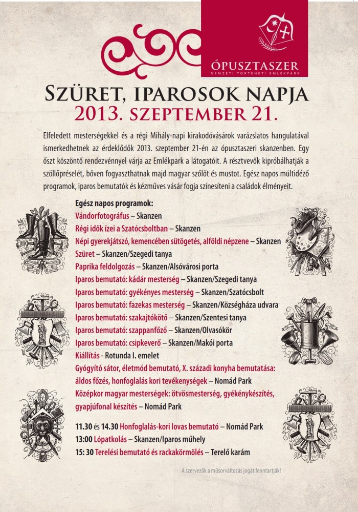 A hagyományos Szüret és Iparosok Napja elnevezésű programon felidézik a régi Mihály-napi kirakodóvásárok hangulatát. A skanzenben szinte minden tanya és ház udvara élettel telik meg, minden portán valamilyen népi iparos mutatja be mesterségének fortélyait. Az őszi munkálatok közül kiemelt figyelmet kap természetesen a szüret, de bemutatjuk a híres szegedi fűszerpaprika feldolgozásának munkafolyamatait is. Az érdeklődők a szemlélődés mellett tevékeny részesei lehetnek a napnak, préselhetnek szőlőt és kipróbálhatják a lábbal működtetett paprikamozsarat, a külüt is. Az Iparos műhelyek környéke patkolókovácsok ritmusos kalapálásától lesz majd hangos, ahol tanúi lehetünk egy lópatkolásnak is. A kovácsműhely kohója mellett az olvasóköri kemence is felizzik: az itt készült finomságokat bárki megkóstolhatja és hazaviheti a recepteket. A gyermekeket egész nap népi játszóház várja a Tanyai iskola udvarán, a szüreti készülődés jó hangulatáról népzenészek gondoskodnak.