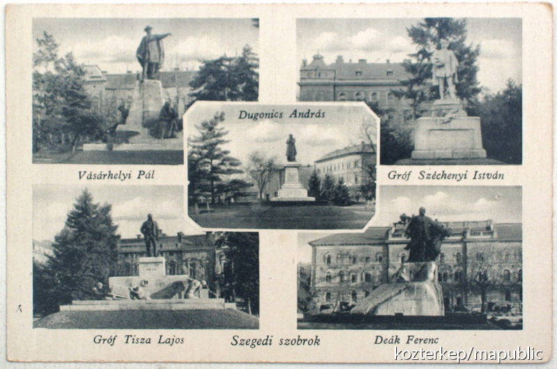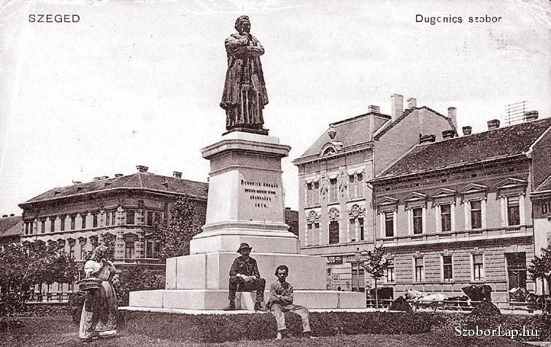 „A Du­go­nics-szo­bor ere­de­ti­leg kö­rül­be­lül ott áll­ha­tott, ahol most a szö­kő­kút van, és Du­go­nics a vá­ros fe­lé né­zett, há­ta mö­gött volt az egye­tem – ma­gya­ráz­za Tol­nay Jó­zsef, mi­köz­ben né­hány ré­gi ké­pes­la­pot tesz elém. A szo­bor tal­pa­za­tát iszt­ri­ai szür­ke­már­vány-tömb­ből fa­rag­ta Luigi Con­ti, a Mo­nar­chia egyik leg­ne­ve­sebb kő­fa­ra­gó­ja. A szo­bor­hoz egyéb­ként több ki­sebb anek­do­ta is kap­cso­ló­dik. A városi legenda ar­ról szólt, hogy ké­sőbb, mi­kor a té­ren hát­rébb ke­rült Du­go­nics, és szem­be­for­dí­tot­ták az épü­let­tel, azon tű­nő­dött, ho­gyan ke­rül­het­ne fel az épü­let te­te­jé­re, a szfin­xek közé… – me­sé­li mo­so­lyog­va a szak­em­ber. Az 1876-ban fel­ava­tott szob­rot egyéb­ként 1895-ben he­lyez­ték a tér kö­ze­pé­re, mai he­lyé­re. Az ak­ko­ri hir­te­len át­he­lye­zés nyo­mán ke­let­ke­zett a sze­ge­di mon­dás: „Möglépött, mint Du­go­nics.”
