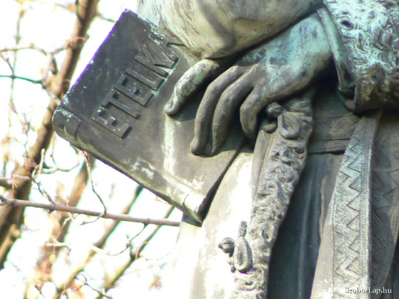 Dugonics-szobornál Izsó helyénvalóan alkalmazta az attribútumot. Az író keresztbe font jobb kezében könyvet tart és ezzel azt a benyomást kelti, hogy gondolatba mélyedve felejtette kezébe. A könyv fedőlapján fő művének a címe olvasható: ETELKA. Luigi Conti – a talapzat építője – léptékében kitűnően alkalmazkodott a szobor méreteihez, arányaihoz. A párkányzatok szolidak és mértéktartóak.