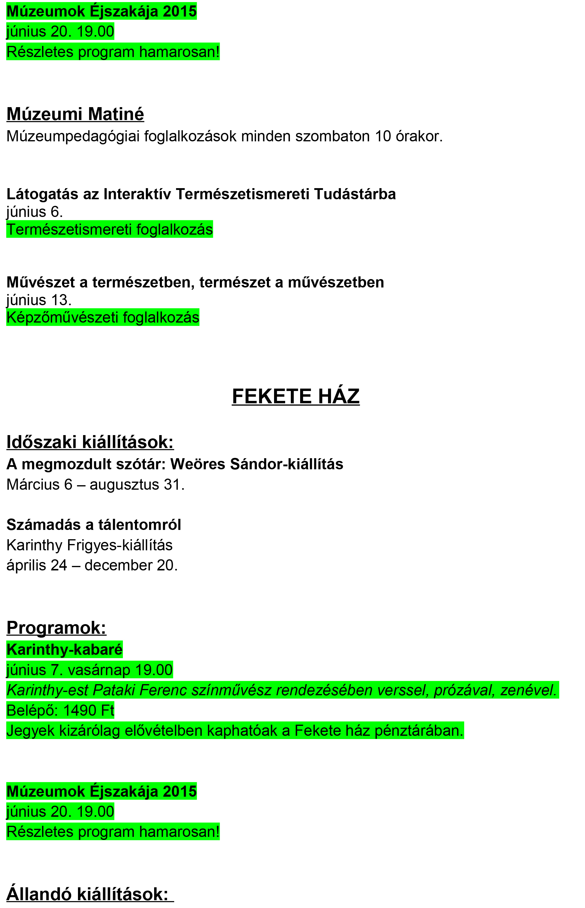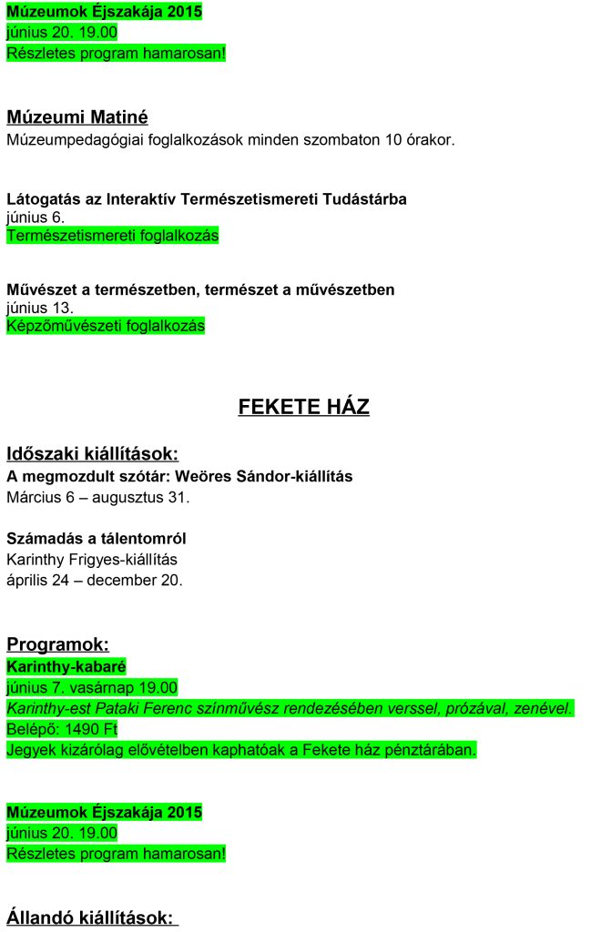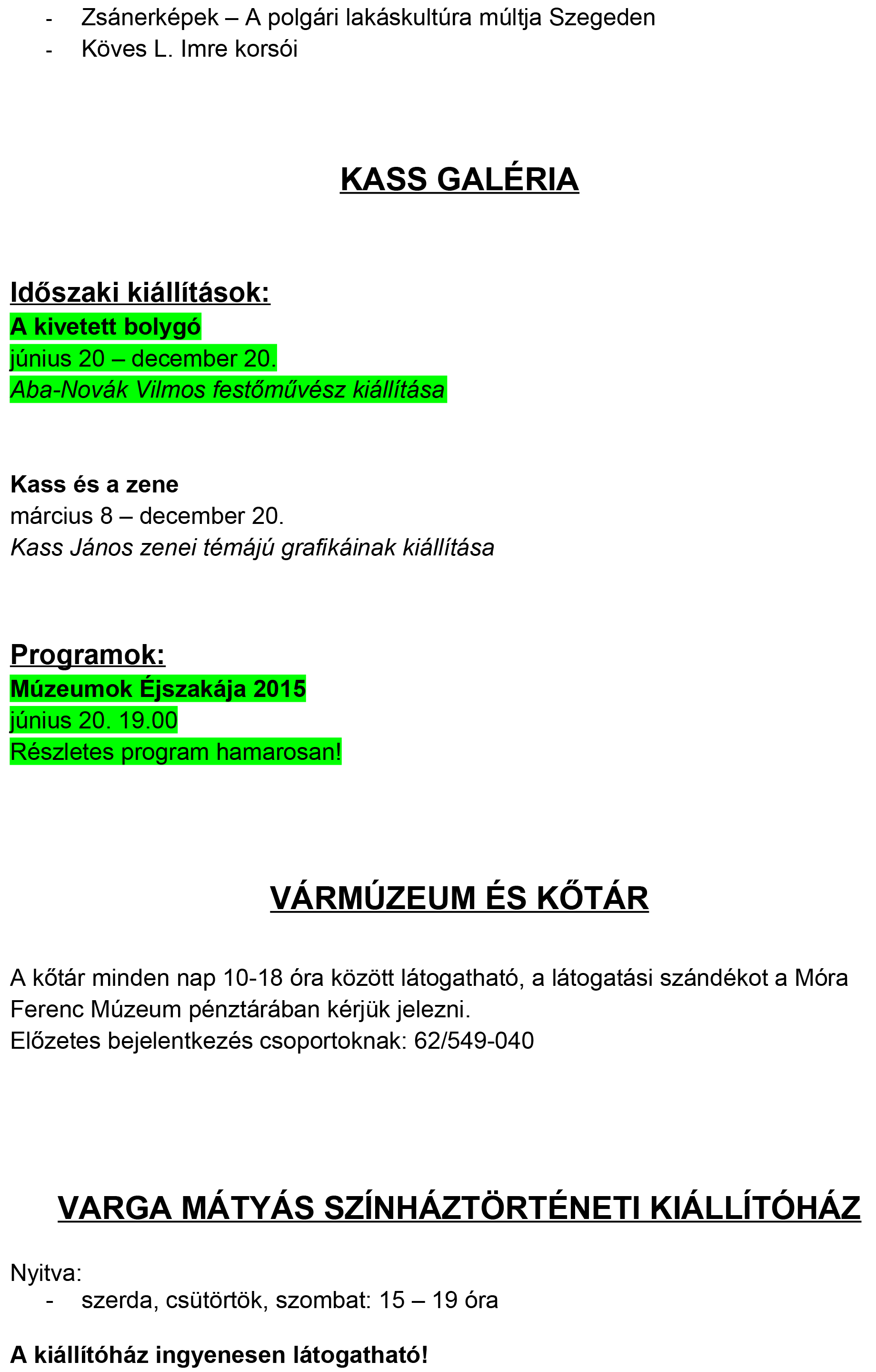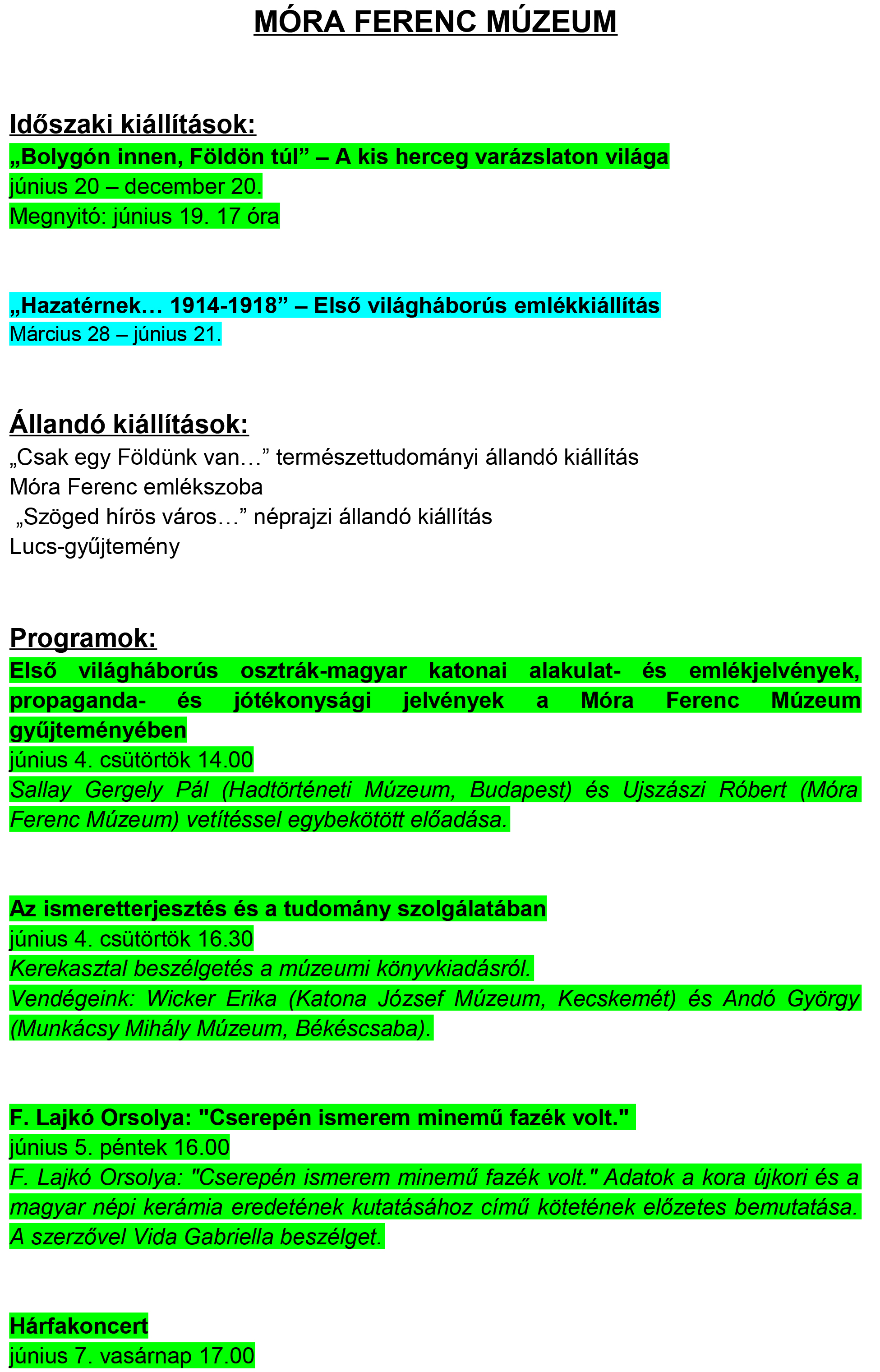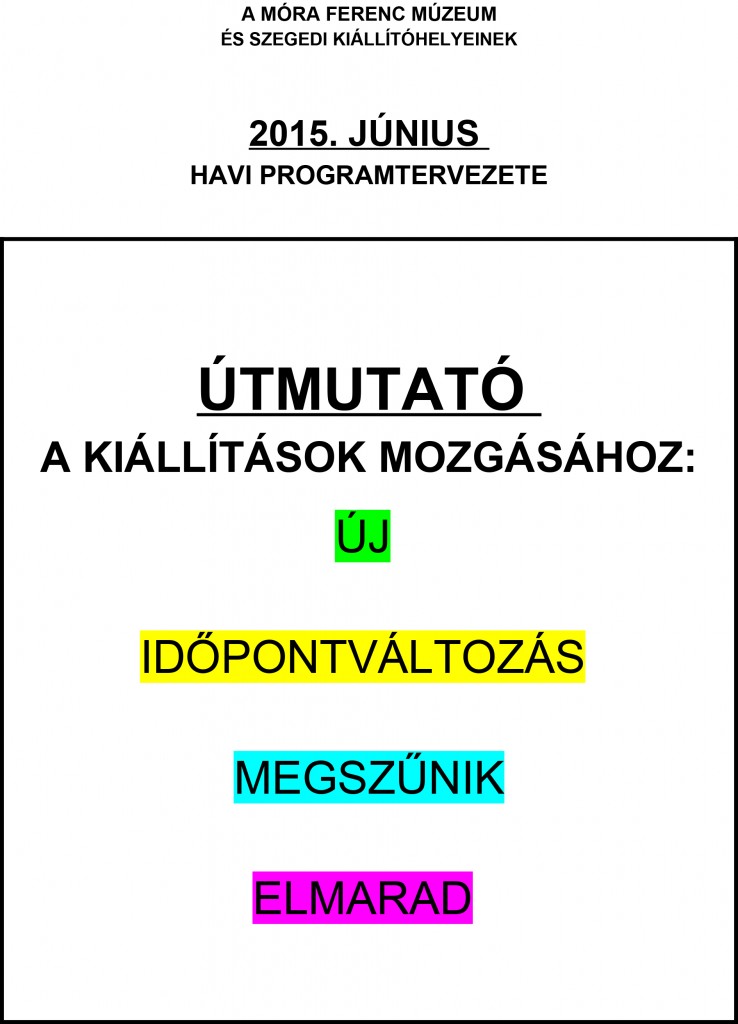 A Móra Ferenc Múzeum és szegedi kiállítóhelyeinek programtervezete – 2015. június